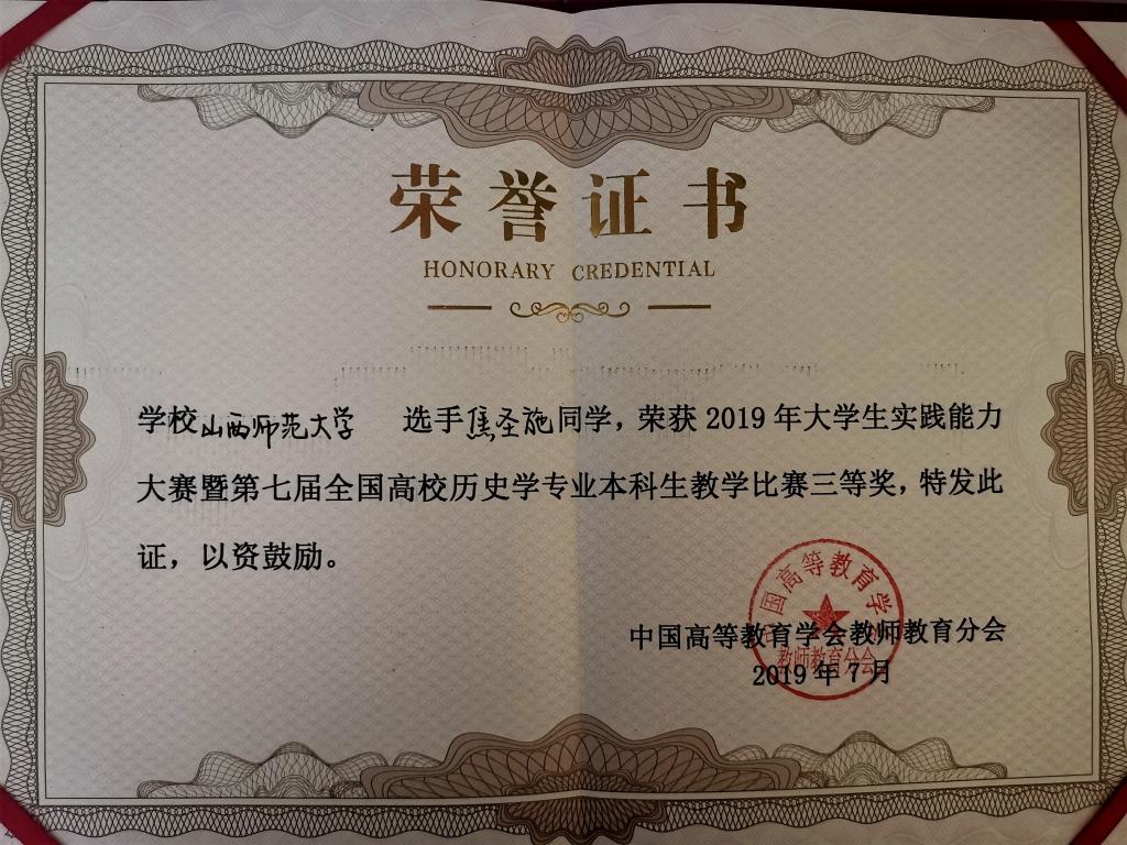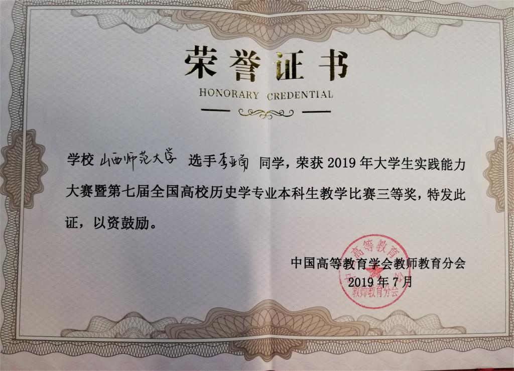 7月20日至24日,2019年老员工实践能力大赛暨第七届全国高校历史学专业本科生教学技能比赛在江苏师范大学举行。公司带队教师樊百玉、指导教师贾亚宾带领2016级历史学专业员工赴江苏参赛。其中,焦圣施、李亚南同学双双荣获说课组三等奖。
