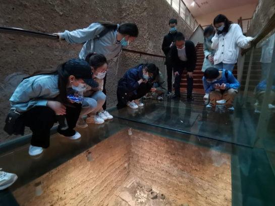 晋国博物馆依晋侯墓而建,保留着原始而真实的墓葬规格,晋侯墓地遗址展厅重点展示了晋侯燮父、晋献侯、晋穆侯、晋靖侯等四组晋侯与夫人墓葬以及陪祭车马坑。霍斌老师针对墓葬结构向同学们进行了知识拓展。