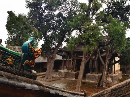 下午4:20,霍斌老师带领员工们到达第三站考察地点——中国历史文化名镇汾城古镇。这里位于汾河西畔、距襄汾县城西南16公里处,是历史上太平县的县城所在地。镇内建筑遗存十分丰富,以鼓楼为中心依次由北向南排列为城隍庙、文庙、明轮堂、古楼、砖塔、县衙大堂、关帝庙、社稷庙等,被誉为山西省十大古建群之一。汾城古镇遗址保护完善,其中最有建筑特色以及反映传统建筑特征的莫过于城隍庙和文庙。其中城隍庙一进门的戏台被称为“过路式戏台”,戏台做工精细,用料讲究,霍斌老师为同学讲述了城隍庙大殿主体的建筑特征以及元代建筑风格表现。