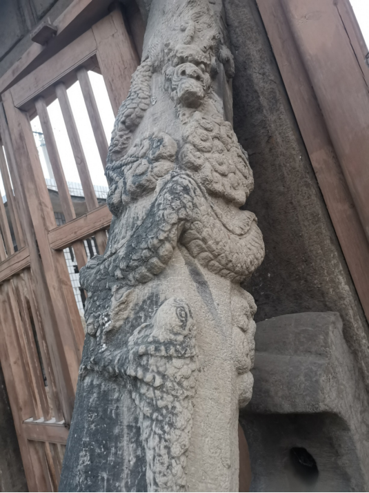 一座古城的文脉中心,便是祭祀孔圣人的文庙,汾城的文庙就在城隍庙的前面。城隍庙门前的照壁,实为文庙的后墙。文庙前端,一通“文武官员军民人等到此下马”的石碑旁,一座石构的棂星门赫然矗立。门内外的四根戗柱上,盘绕着高浮雕的盘龙,龙爪握鱼,下托脊兽,十分新奇。