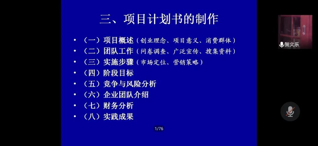 讲座开始,阎老师向同学们介绍了贺文乐副教授的个人基本情况及他在指导员工参加创新创业大赛方面取得的成果。接着,贺文乐副教授从项目的选定、团队建设、项目计划书的制作三方面进行介绍,并在此过程中结合自身经历,向同学们具体阐述了如何较好地参加创新创业的比赛。最后,贺文乐副教授与同学们分享了一些老员工创新创业的感想,提示同学们一定要结合时事、结合专业、全方位获取信息,同学们颇有感触,收获颇丰。
