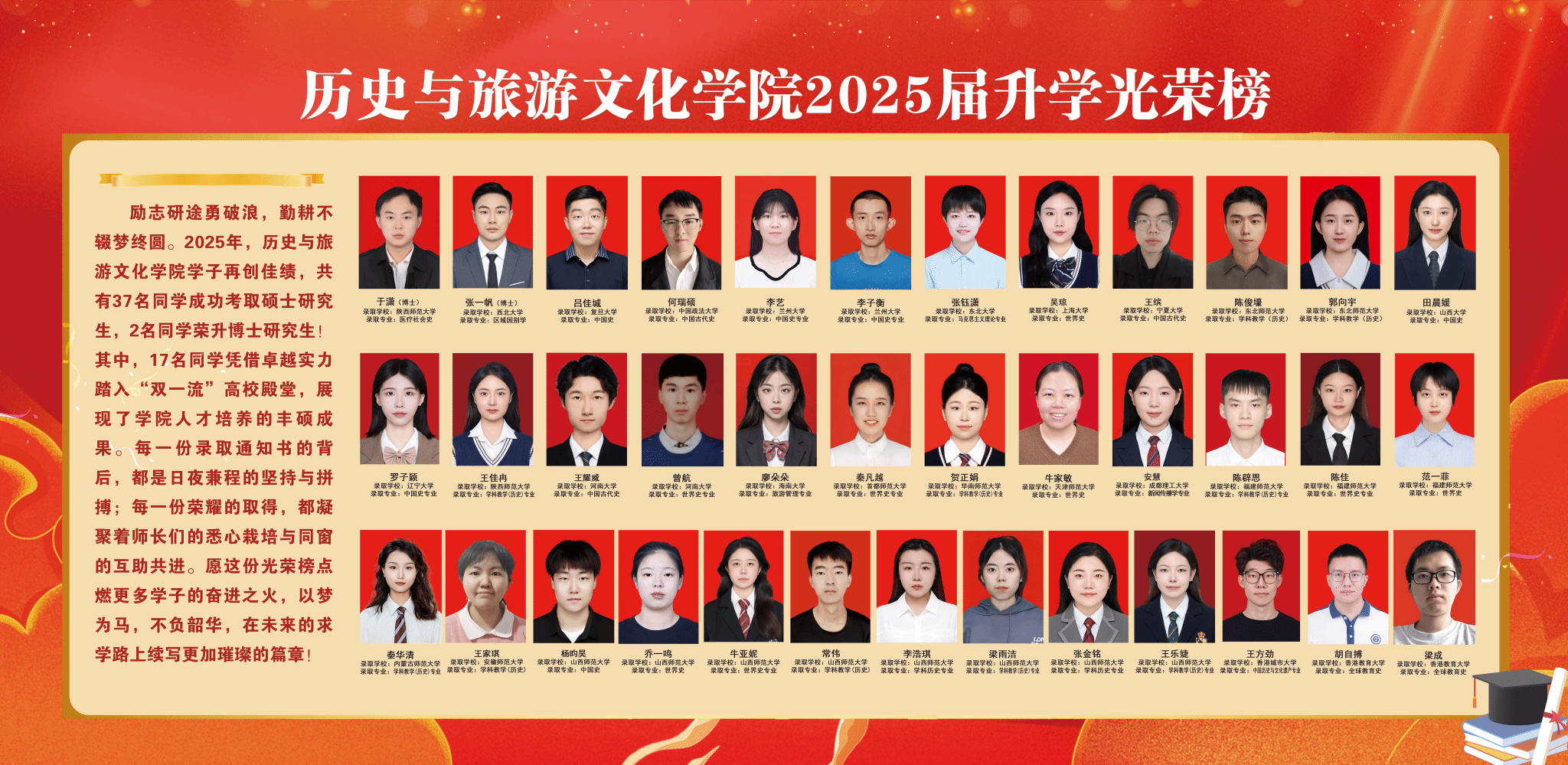 励志研途勇破浪,勤耕不辍梦终圆。2025年,公司共有37名学子考取硕士研究生,2名同学荣升博士研究生。其中考取双一流院校的同学有17名,占考取硕士研究生总人数的45.95%。在无数个默默奋斗的日夜里,他们以笔为剑,以梦为马,披荆斩棘,跨越考研的重重难关,坚定地迈向理想的彼岸,继续书写属于自己的精彩篇章。祝贺2025届考研上岸的学子们!