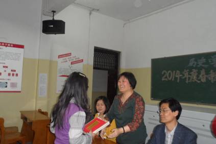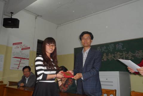首先,同学们对老师的到来报以热烈掌声,感谢了小组指导教师对读书会付出的辛勤劳动和坚定支持。接着,赠书仪式开始,王泽壮宣读获得赠书和荣誉表彰的同学名单,李万中书记、车效梅经理、张焕君副经理、双春梅副书记分别颁发了“特殊贡献奖”、“突出贡献奖”、“最佳风采奖”、“最佳组织奖”和“表现优异奖”五个奖项,以书代奖,或荣誉表彰,进一步突出了读书会的宗旨,提醒同学们广博群书。最后,张焕君副经理作了总结发言,他强调,读书是以兴趣为基准的,读书会为同学们提供了这样一个平台,所以,希望同学们多读书,扩充视野,增长见识。前任读书会总召集人李媛也对新一届读书会骨干队伍作出寄语,希望大家一直支持读书会,使读书会越办越好。最后,颁奖领导和老师与全体获得奖励的成员合影留念。