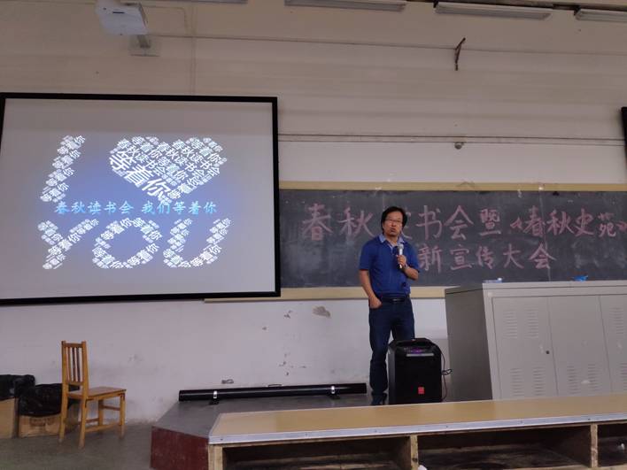 会议开始,首先是副会长姜雪萌同学开始介绍春秋读书会的发展历程和创办初衷,旨在给新生一个大致的了解。之后给大一新生详细介绍了读书会的十四个小组的组别和指导老师,并向新生阐明了读书会个小组的读书特点和类型,鼓励大一新生发掘自己的历史兴趣,选择参加最适合自己读书的类型和时期的组别。随后张焕君老师上台来再次介绍读书会,向新生表达了公司老师对大一新生的期待和鼓励,号召大家积极参与读书会的活动。在此期间,张老师详细地表达了自己创立读书会的愿景,并继续大力支持读书会的决心。同时张老师还谈到了读书带给人的意义和价值,以及读书对他本人的影响和作用。最后再次鼓励新生积极加入春秋读书会和春秋史苑杂志。接下来是由春秋读书会会长李万荣同学向在场的大一新生发出诚挚的邀请,并向新生表明了读书会的宗旨和立场,并发出了对新同学的期冀。
