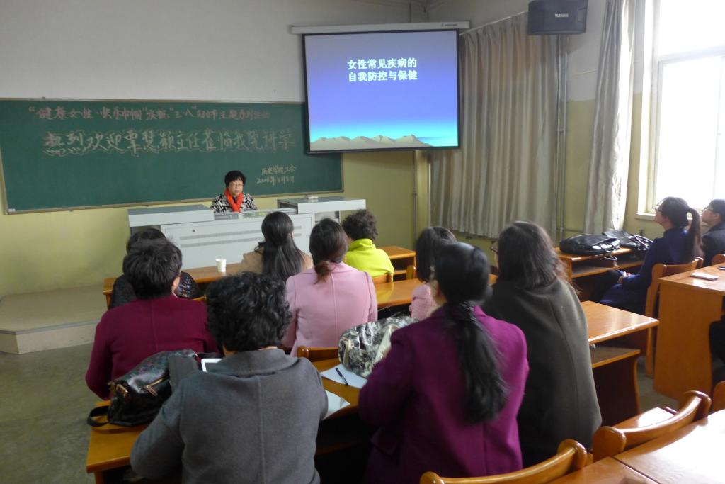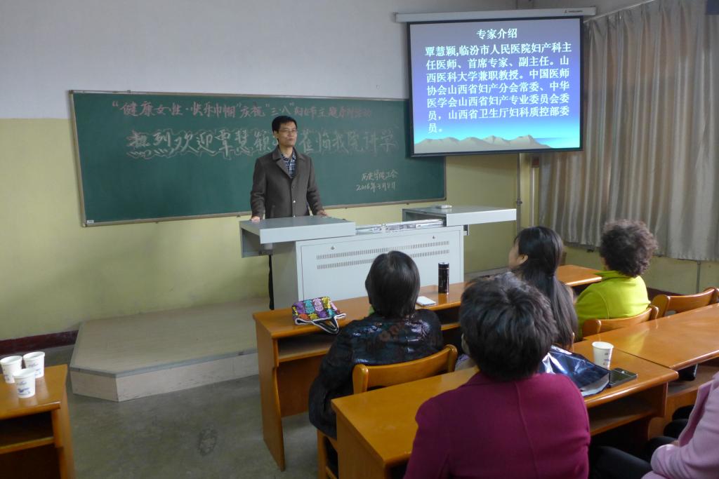 首先进行的是公司为女教职工举办的女性医疗保健知识讲座。应公司邀请,在校医院赵梅经理的陪同下,由临汾市人民医院妇产科主任医师、山西医科大兼职教授覃慧颖大夫在01402多功能会议室为公司女教师和男教职工家属做了题为“女性常见疾病的自我防控与保健”的知识讲座,部分女员工代表也聆听了此次讲座。近两个小时的生动演讲和互动问答,覃大夫以她30多年的临床和教学知识,用一个个鲜活生动的医疗案例,引来与会者时而点头认同,时而会心一笑,赢得了会场的阵阵掌声,大家感到受益匪浅。