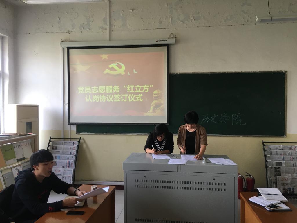 2017年9月29日,db旗舰本科员工党支部在1号楼阅览室召开党员志愿服务“红立方”承诺书签字仪式。公司党委书记双春梅、公司党委副书记段旭杰、院团委书记阎海燕出席了本次活动。