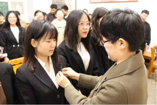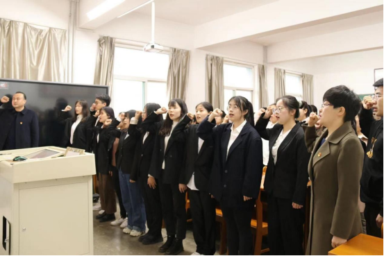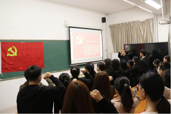 活动伊始,全体起立,奏国际歌,现场庄严而肃穆。在段老师的带领下,全体新党员齐诵入党誓词,郑重许下承诺,老党员重温誓词。随后,段老师和阎老师为新党员们佩戴党员徽章,阎老师讲解填写入党志愿书的注意事项,段老师希望优秀年轻党员要信念如磐、意志如铁、勇往直前,遇到挫折撑得住,关键时刻顶得住,扛得了重活,打得了硬仗,经得住磨难。