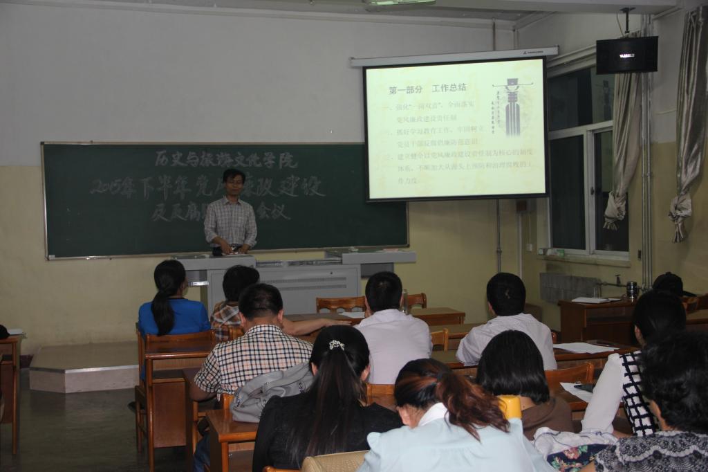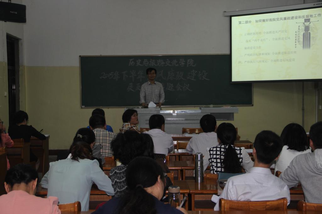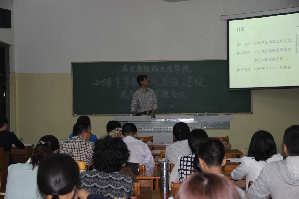 2015年9月23日晚,公司在01402教室召开了2015年下半年党风廉政建设及反腐败工作专题会议,全院教师参加会议,会议由经理车效梅主持。