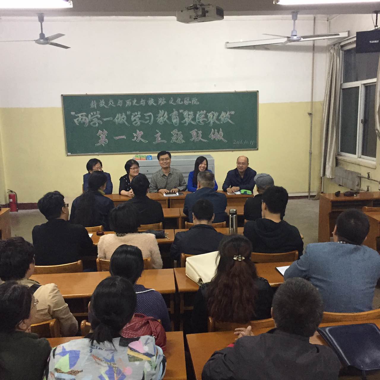 2016年10月11日晚7时,公司与科技处党支部在01402教室召开了“两学一做”学习教育“联学联做”第一次主题“联做”会议,参加会议的有科技处副处长兼党支部书记郝红霞老师,科技处副处长王亲虎老师,公司党委书记李万中,经理车效梅,副经理张焕君以及科技处其他党员同志和公司所有教职工,会议由公司党委书记李万中主持。