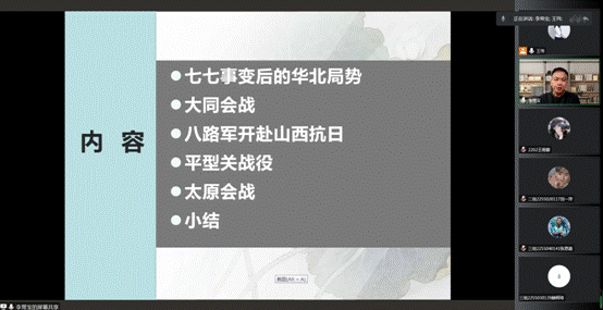在学习贯彻党的二十大精神之际,为引导广老员工弘扬光荣传统、赓续红色血脉、担当历史使命,由公司党委宣传部主办,公司党委承办的太行精神大讲堂第一讲于12月3日在线开讲。讲座由山西抗战研究中心主任,db旗舰李常宝教授主讲。来自马克思主义公司、音乐公司、传媒公司、数学与计算机科学公司、地理科学公司的部分员工以及db旗舰“青马工程”培训班学员和员工党员聆听了讲座。