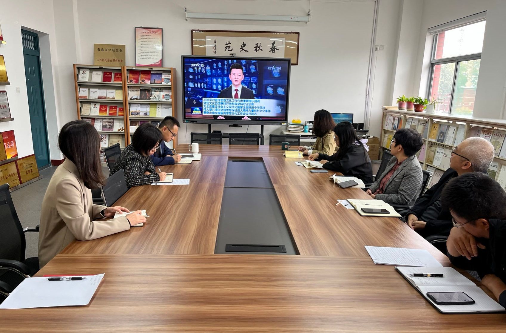 在交流讨论环节,中心组成员联系工作和学科专业,结合学习内容进行了发言,从“文化自信是‘四个自信’的基础,是更基础、更广泛、更深厚的自信”“文化的守正与创新”“如何深入挖掘研究晋国文化”,以及“文化浸润课程思政”等方面分享了心得。大家一致认为要自觉承担文化使命,凝心铸魂,以德育人,坚持引领,坚守阵地,传承弘扬中华优秀传统文化和革命文化,努力为文化自信自强贡献力量。