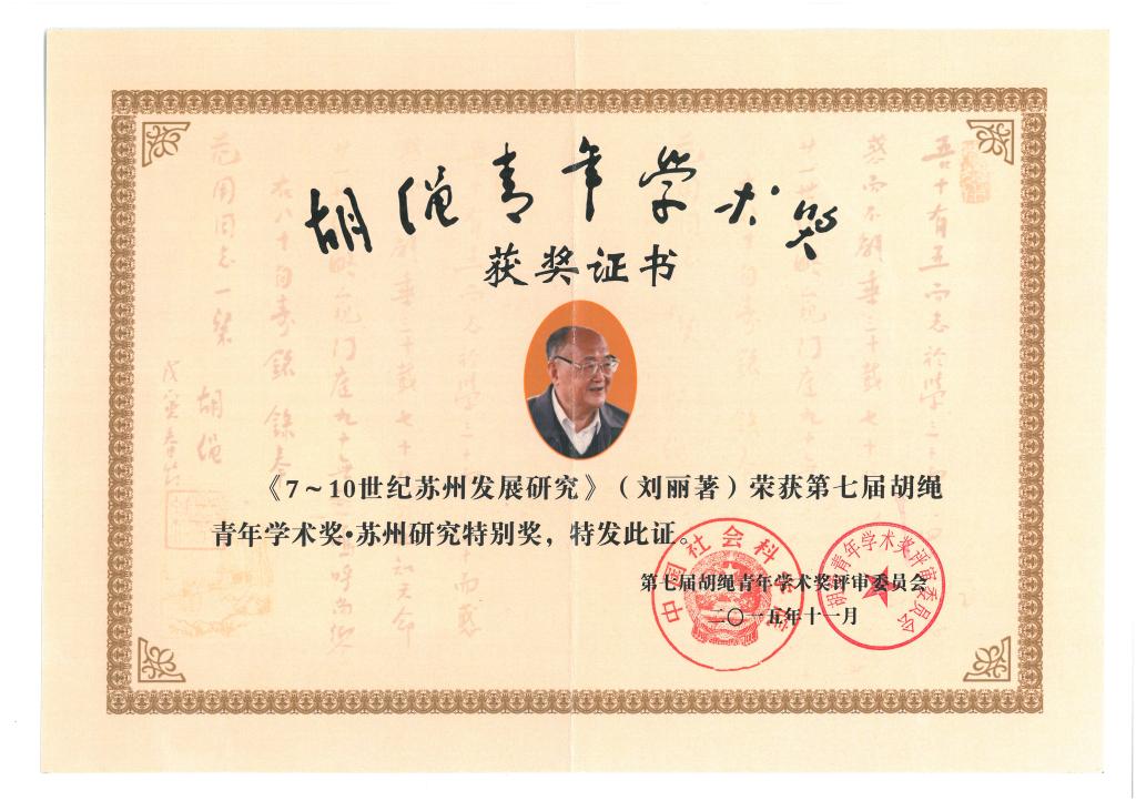 公司教师刘丽副教授荣获第七届“胡绳青年学术奖·苏州研究特别奖”