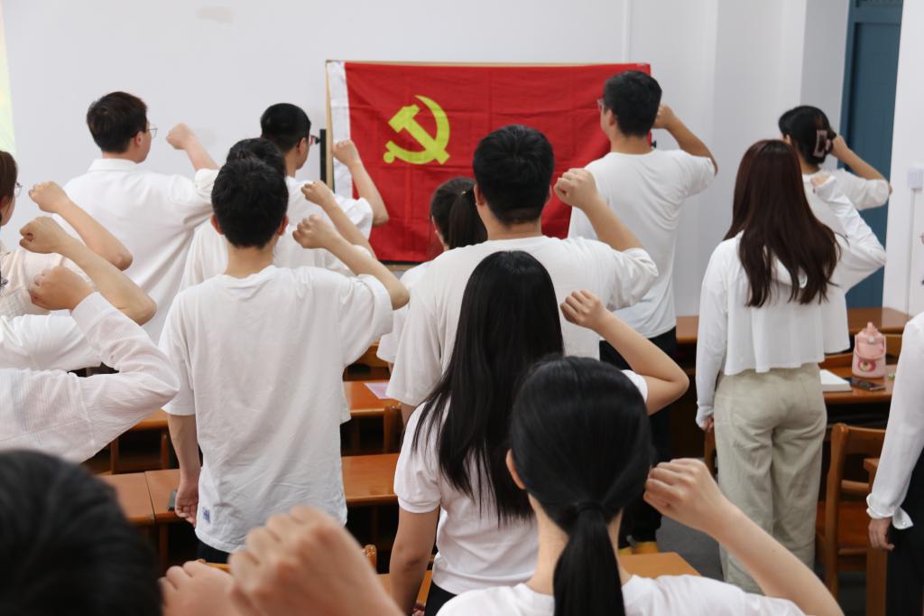 活动最后,1901班曹建华同学带领全体毕业生党员面对鲜红的党旗重温入党誓词,铿锵有力的宣誓声在会议室久久回荡,激发着同学们将爱国之心、报国之志、强国重任记于心中,在新时代的滚滚洪流中发光发热、绽放光彩。