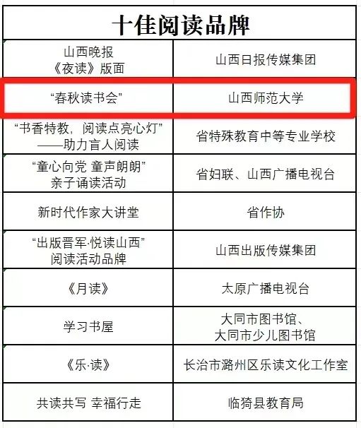 日前,“书香山西”全民阅读活动组委会对山西省2023年全民阅读系列推荐活动入选名单进行了公示,公司“春秋读书会”入选“十佳阅读品牌”。