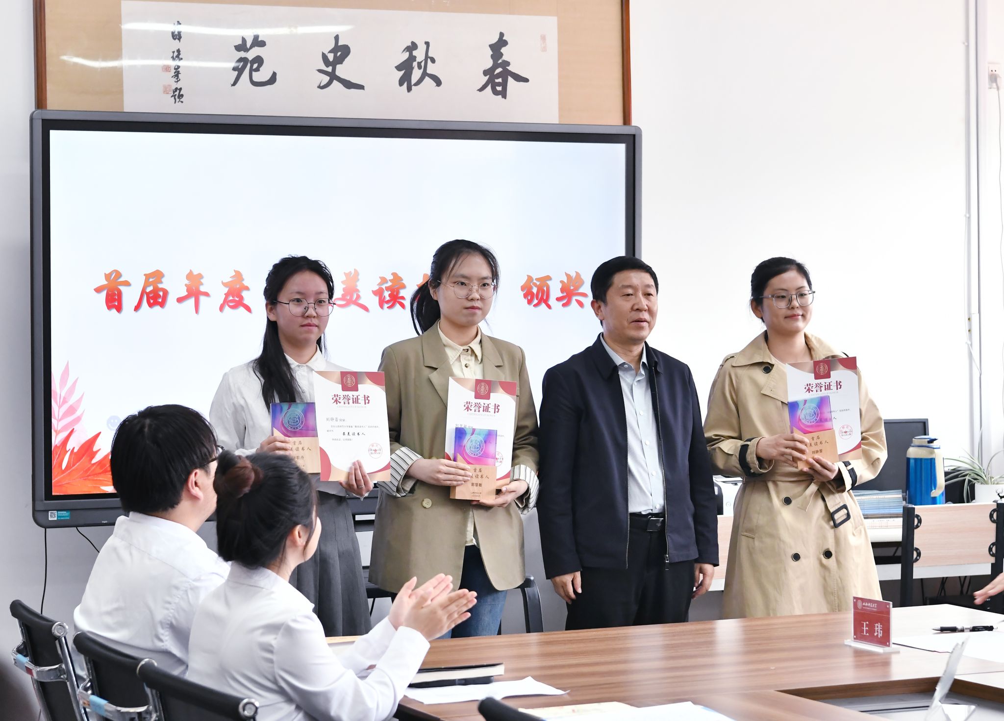 分享会上,春秋读书会会员冀玉泫、王怡然、杨倩、周恺、曹津玮、马海艳等六位同学就近期阅读的《习近平著作选读》《人类简史》《中国历代政治得失》等书籍进行了心得分享。会议还对db旗舰举办的“阅享书香,青春师大”读书系列活动之“读书与我”主题征文和首批年度“最美读书人”评选活动的获奖者进行了表彰。“最美读书人”外国语公司本科生郭慧敏同学在分享自己的读书心得时谈到:“在阅读的过程中,我们应当悉心听取书中智者的教诲,用思考驱散内心的迷茫与困顿,努力抵制平庸的侵蚀。”教育科学公司研究生赵若丹同学表示:“在我心中,书籍是高尚与力量的化身。读书不仅能提升我的专业素养,而且能净化我的灵魂,使我能更了解我自己,完善我的人格。在与世界的对话中,我愈来愈有力量,在前往未来的路途中亦更坚定。”