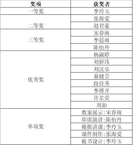 比赛主要包括教案展示、即席演讲、模拟讲课、课件制作和板书设计等内容,深入考察选手们的综合素质和专业能力。选手们依次登台,以良好的精神风貌展现了娴熟的教学技能和风采,凭借生动巧妙的课堂导入、扎实过硬的教学功底、自然得体的教学仪态、美观大方的课件展示得到了现场评委和观众的阵阵掌声。评委点评环节中,各位评委对选手们的表现给与了高度评价,点明了选手们的优缺点,从内容选择、课程设计、教态仪态、课件板书等方面提出了宝贵意见。
