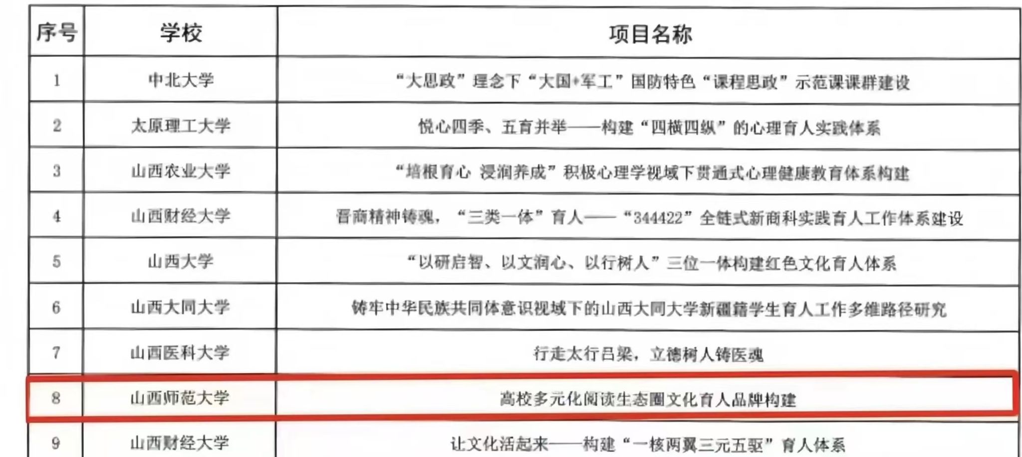 近日,山西省教育厅公布了2025年度山西省高校思想政治工作质量提升综合改革与精品建设项目立项评选结果。经各高校申报、资格审核、专家评审等程序,公司组织申报的实践育人项目《高校多元化阅读生态圈文化育人品牌构建》获得立项支持。