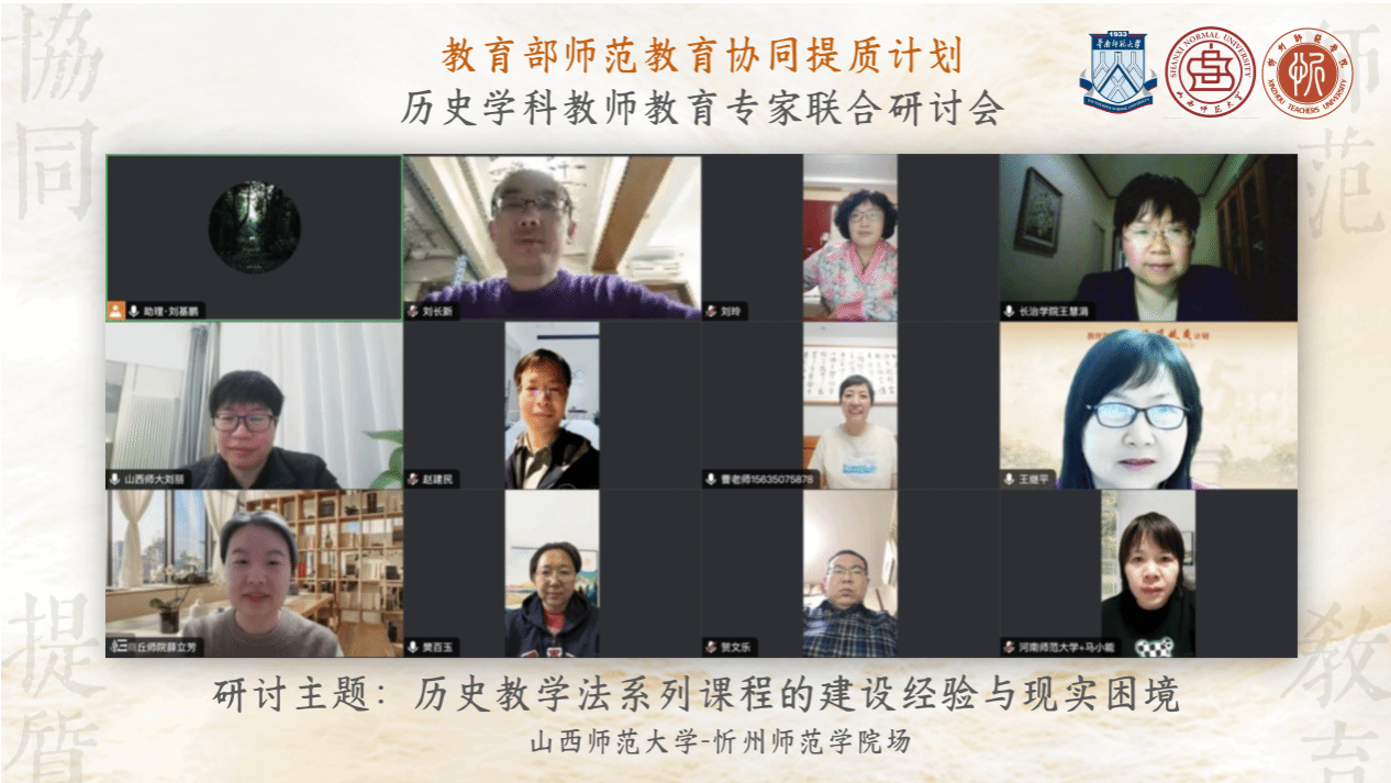 4月11日,教育部师范教育协同提质计划历史学科教师教育专家联合探讨会“db真人--忻州师范公司”专场通过腾讯会议举行。本次研讨会由华南师范大学历史文化公司发起,公司协同忻州师范公司参与策划与组织,同步参加研讨的还有江苏师范大学、河南师范大学、长治公司与商丘师范公司的教师,来自多所院校的历史教法教师就中学历史教育系列课程的建设经验与现实困境展开研讨。会议由华南师范大学历史文化公司王继平教授主持。