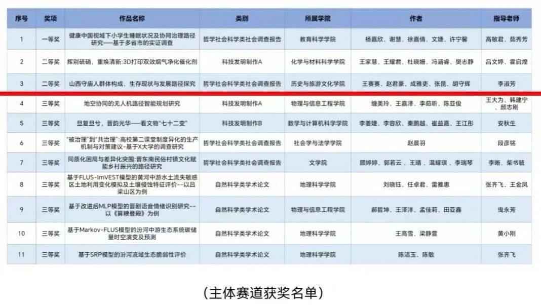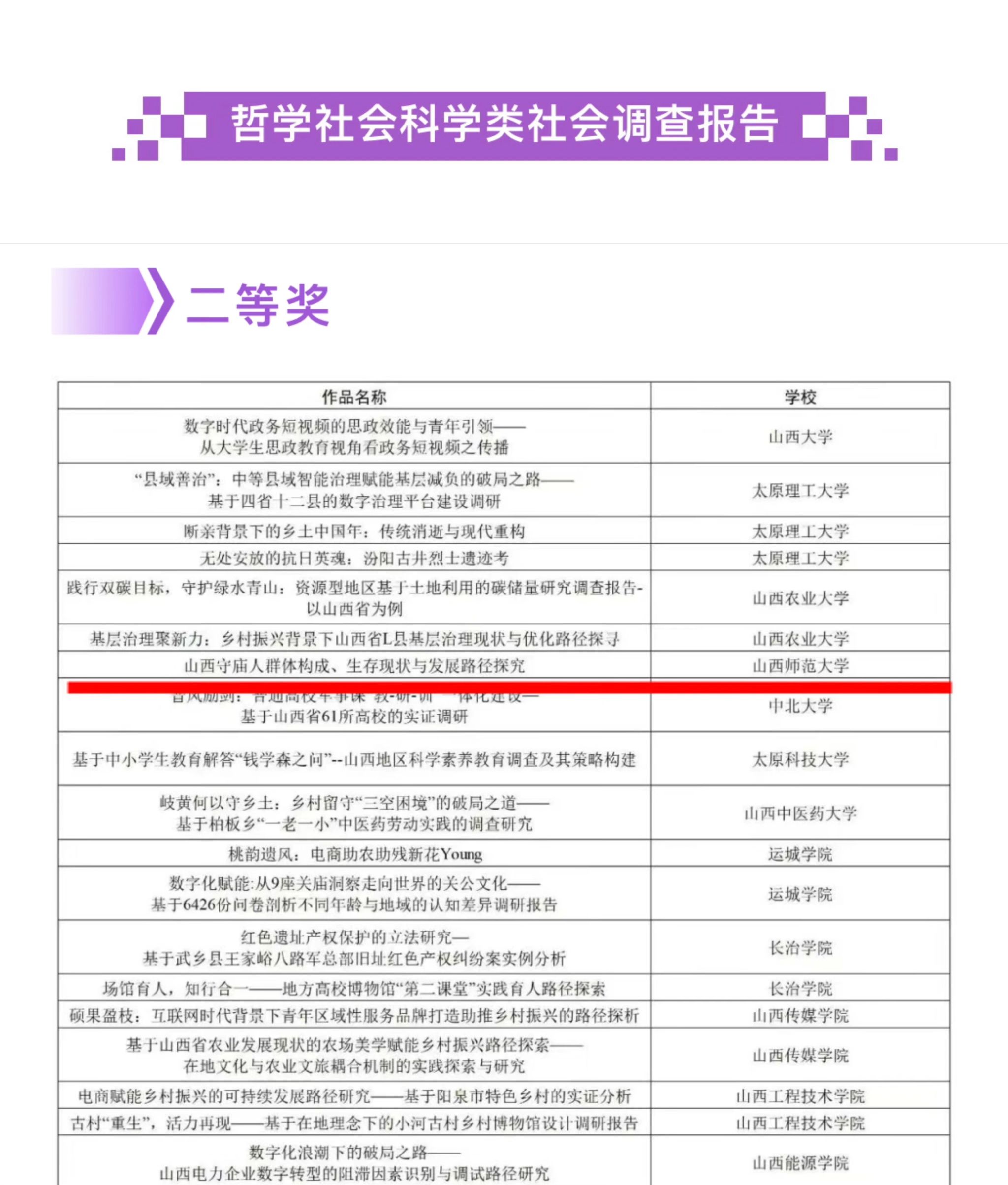 耕耘不辍结硕果,载誉远航启新程。由公司李淑芳老师指导,王赛赛、赵君豪、成雅吏、胡守辉、张昆五位同学完成的作品《山西守庙人群体构成、生存现状与发展路径探究》在第十九届“挑战杯”山西省老员工课外学术科技作品竞赛中获得二等奖。