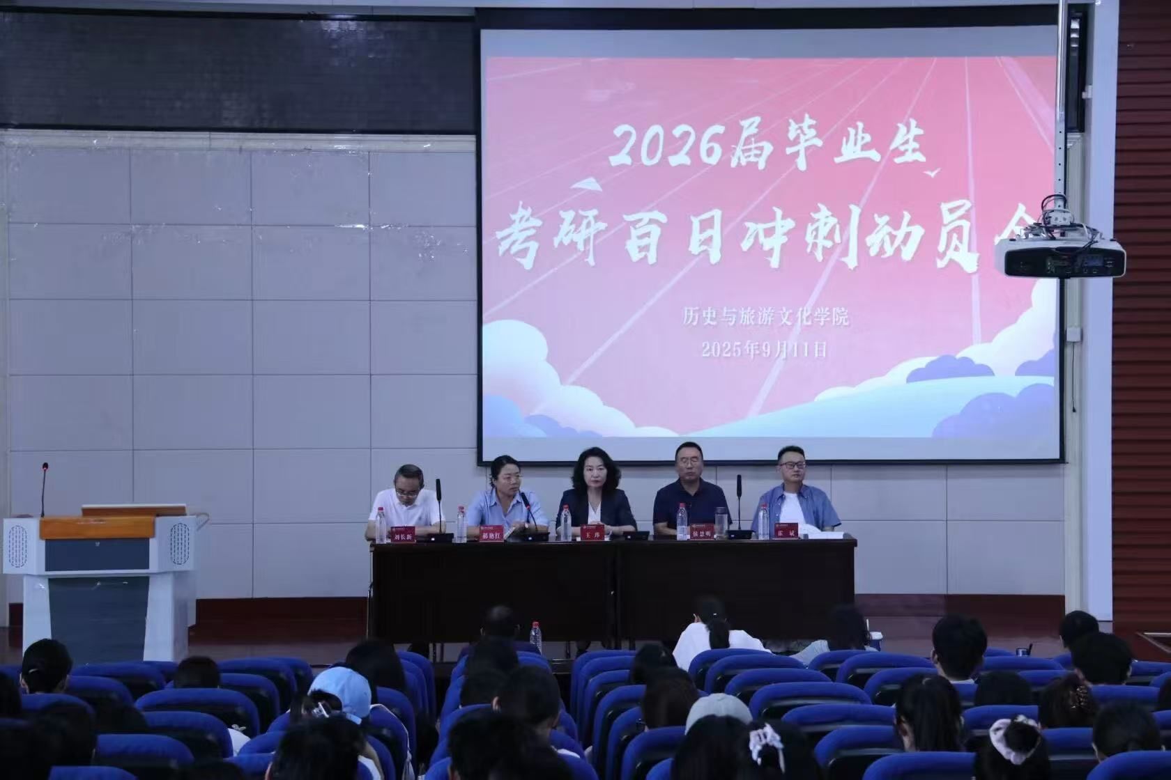 逐梦研途,冲刺攻坚。为帮助2026届毕业生明确考研方向、提振备考信心,9月11日上午,公司在实验楼一层报告厅召开2026届毕业生考研百日冲刺动员会。全体院领导、历史系主任刘长新副教授、旅游管理专业教师张江峰副教授、2022级全体辅导员及员工参加了会议。会议由公司党委副书记郝艳红主持。