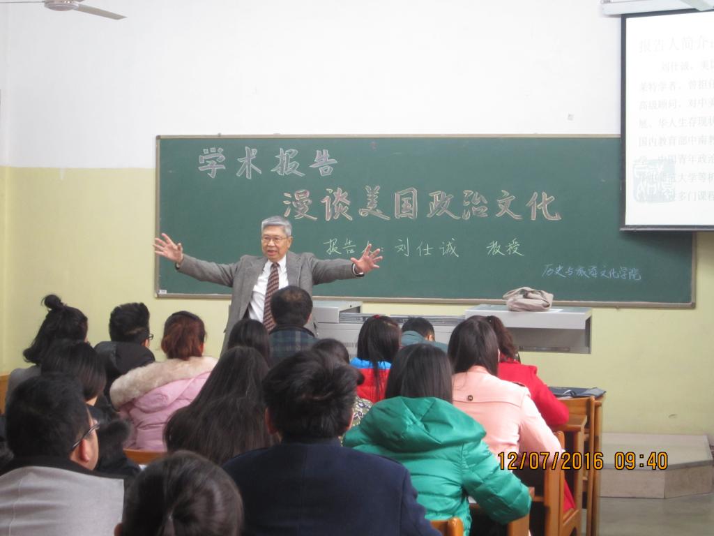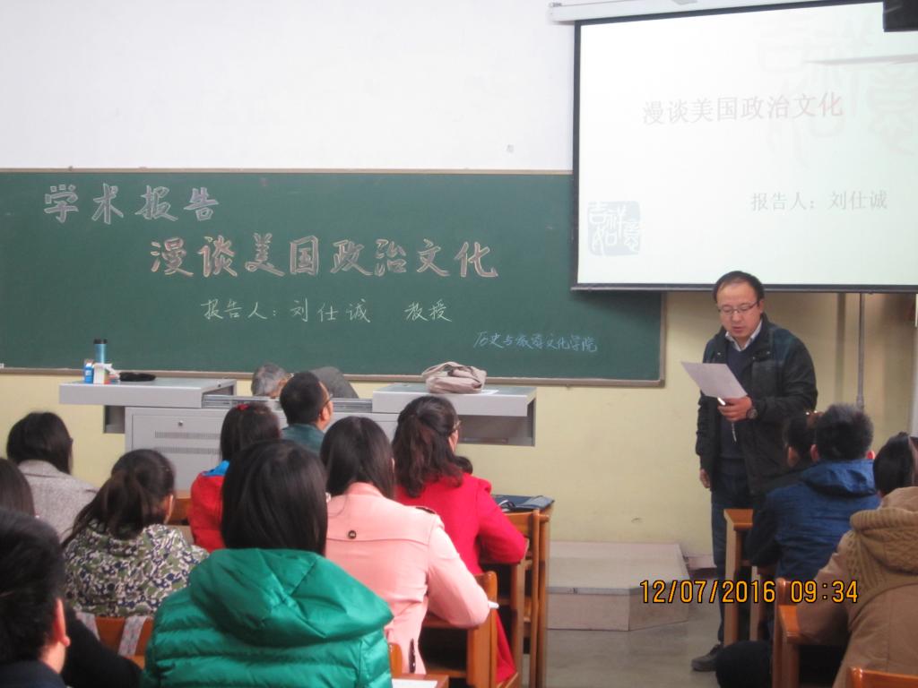 12月7日早9点应历史公司邀请,美国长岛大学的刘仕诚教授在01402教室作了题为《漫谈美国政治文化》的讲座,王志超副教授主持了本次报告。
