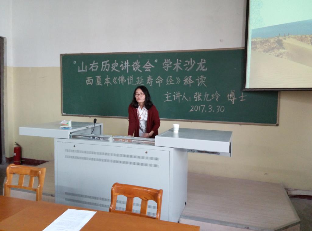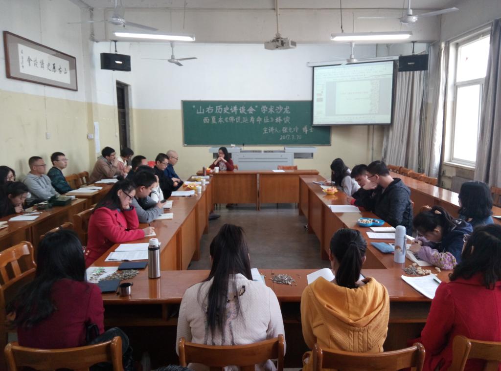 2017年3月30日下午3:00,公司在01402教室举办了“山右历史讲谈会”第二场学术沙龙,主讲人是张九玲博士,主题为《西夏本〈佛说延寿命经〉释读》。讲谈会由仝建平教授主持,侯慧明教授和杨学勇副教授点评,参与此次活动的主要有中国古代史的教师们和中国古代史专业全体研究生。
