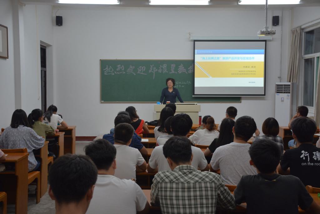 郑老师的报告分三个部分:第一部分,向我们介绍了“一带一路”倡议的提出,她指出,“丝绸之路经济带“和”21世纪海上丝绸之路“借用古代丝绸之路这一历史符号,高举和平发展的旗帜,以积极发展与沿线各国的经济合作伙伴关系,这一战略有利于形成中国对外开放的新格局,会进一步促进亚欧大陆腹地的经济增长。第二部分,郑老师向同学们介绍了”丝绸之路“沿线旅游资源的开发情况,通过对东盟十国以及东南亚的地理环境以及人文资源的介绍,大家对于这一问题有了更进一步的了解。第三部分内容为”海上丝绸之路“区域旅游合作路径,郑老师表示,我国可以通过加强旅游基础设施建设,产业融合发展等途径,逐渐形成”走出去、引进来、留下来”的开发模式,促进区域旅游合作。