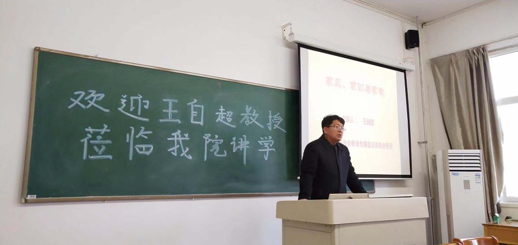 2018年12月11日上午十点,国际儒学联合会教育传播普及委员会委员王建军,字自超,应邀在公司01402教室作了题为《家风家教与家训》的学术报告。db旗舰副经理张焕君教授、畅海桦副教授、李常宝副教授和公司部分研究生参加了报告会。报告由张焕君教授主持,张老师对王自超老师莅临讲学表示了热烈欢迎。