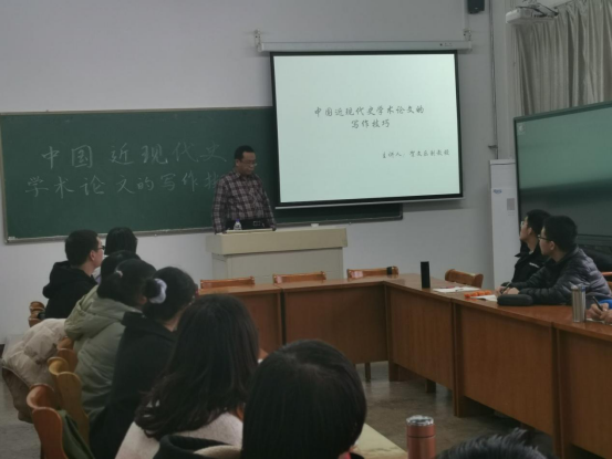 贺文乐老师从选题技巧、文献综述策略、论文布局技巧三方面进行讲解。在选题技巧方面:首先,论文写作需阅读相关文献,尤其是权威出版社和核心刊物与刊登的文献;其次,要选择与现实相关或有学术空白的题目;再者,史料是史学论文得以成型的命脉,所以需搜集大量史料,史料应用也要以第一手资料为主。在文献综述策略方面:需综述史料整理情况及研究著作,重点综述核心期刊论文的主要观点。通过综述,以凝练“问题”,指出未来的研究方向。在论文布局技巧方面:题目要精练并且突出主题,同时注意时间段的选择;摘要主要包括选题缘起、文章主要内容或观点以及文章的学术价值,尤其是现实关怀;关键词要指出研究对象、研究区域、研究时间段;正文需做到思路清晰、论证有力、逻辑合理;结语是对文章内容的总结与升华以及对现实的启示。讲解完毕后,贺老师对同学们提出的问题做了认真细致的回答,本次讲座圆满结束。