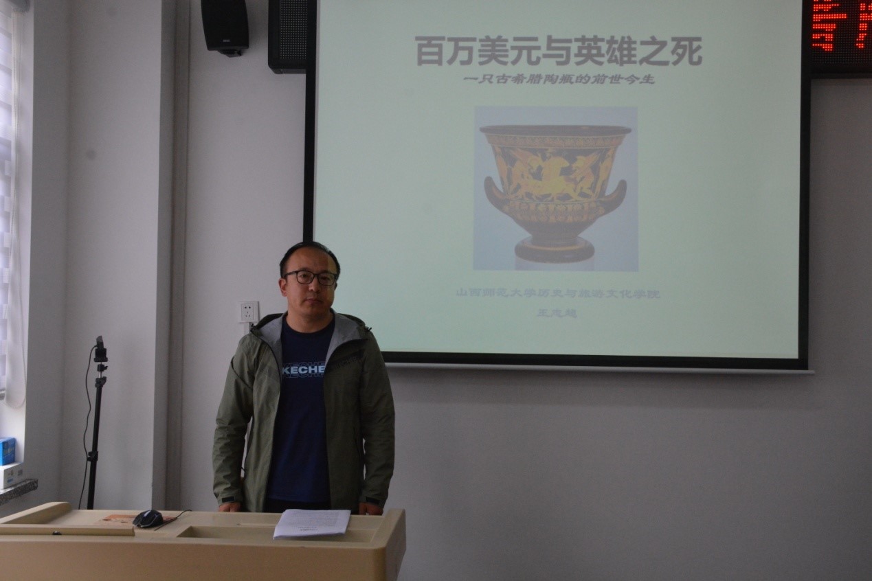报告中,王志超教授从“萨尔珀冬陶瓶”上的图像纹饰着眼,讲述了蕴含其中的艺术价值以及颠沛流离的命运,生动还原了陶瓶上所记载的历史故事,并通过引用丰富详实的史料和文学作品中的记述加以证实,详细介绍了古希腊陶瓶器型、陶器的制作加工过程以及古希腊人的社会习俗等,并就相关问题与师生进行了分享交流,使师生们对古希腊文化风貌有了更为深刻的理解。
