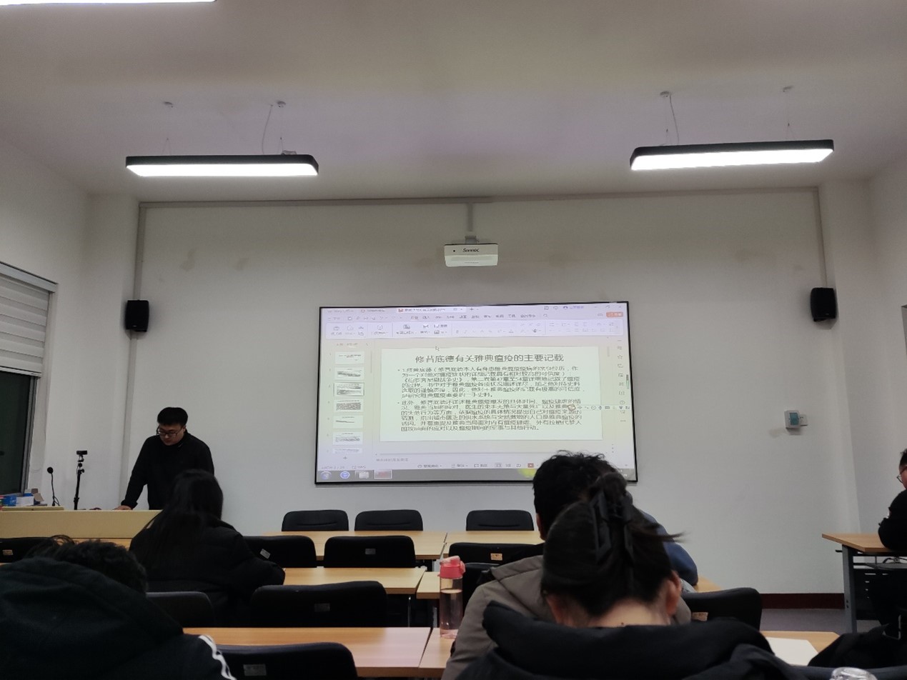 殷开辉博士结合专业知识和史料解读详细地介绍了雅典瘟疫发生的历史背景,对瘟疫记载的客观性提出了中肯的看法。报告期间,殷开辉博士向同学们展示了大量相关史料的图片,通过考古挖掘的角度对雅典瘟疫的主要争论作了解释。
