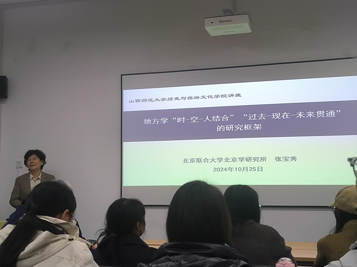 10月25日晚上,北京联合大学北京学研究所所长张宝秀教授应邀在1210会议室为公司师生举行了一场题为《地方学“时—空—人结合”“过去—现在—未来贯通”的研究框架》的学术讲座。讲座由谢耀亭教授主持,中国史、旅游管理专业的研究生和卓越班员工聆听了本场讲座。