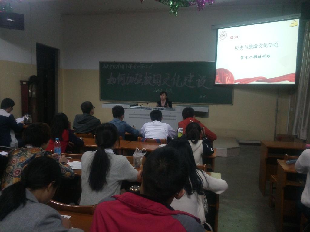在培训中,高老师从校园文化建设的特点、功能及意义三方面出发,向在场的员工干部解释了何为校园文化的建设以及在校园文化建设中各位员工干部的定位与作用,极大地加深了各位员工对校园文化建设的认识。高老师首先根据校园文化的时代性、开放性、创新性和超前性的特点告诫同学们在今后的学习工作中要勤学奋进同时更要做好宣传工作;同时高老师讲授了校园文化的六大功能,提醒各位员工干部要加强自我修养、树立远大的理想和坚强的信念,为建设良好的校园文化氛围做出自己的贡献。