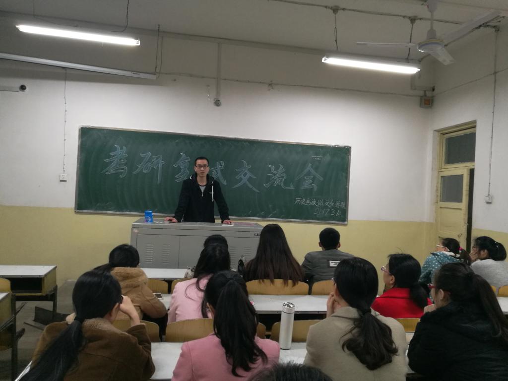2017年3月10日晚,db旗舰在01309教室成功召开了“考研复试交流会”的专题讲座,本次讲座由研一世界史专业赵锦浩,任晓宇;中国古代史专业啼慧,杨月红;中国近代史专业史跃鸣,张晶主讲。大四准备考研复试的成员参加了本次交流会。