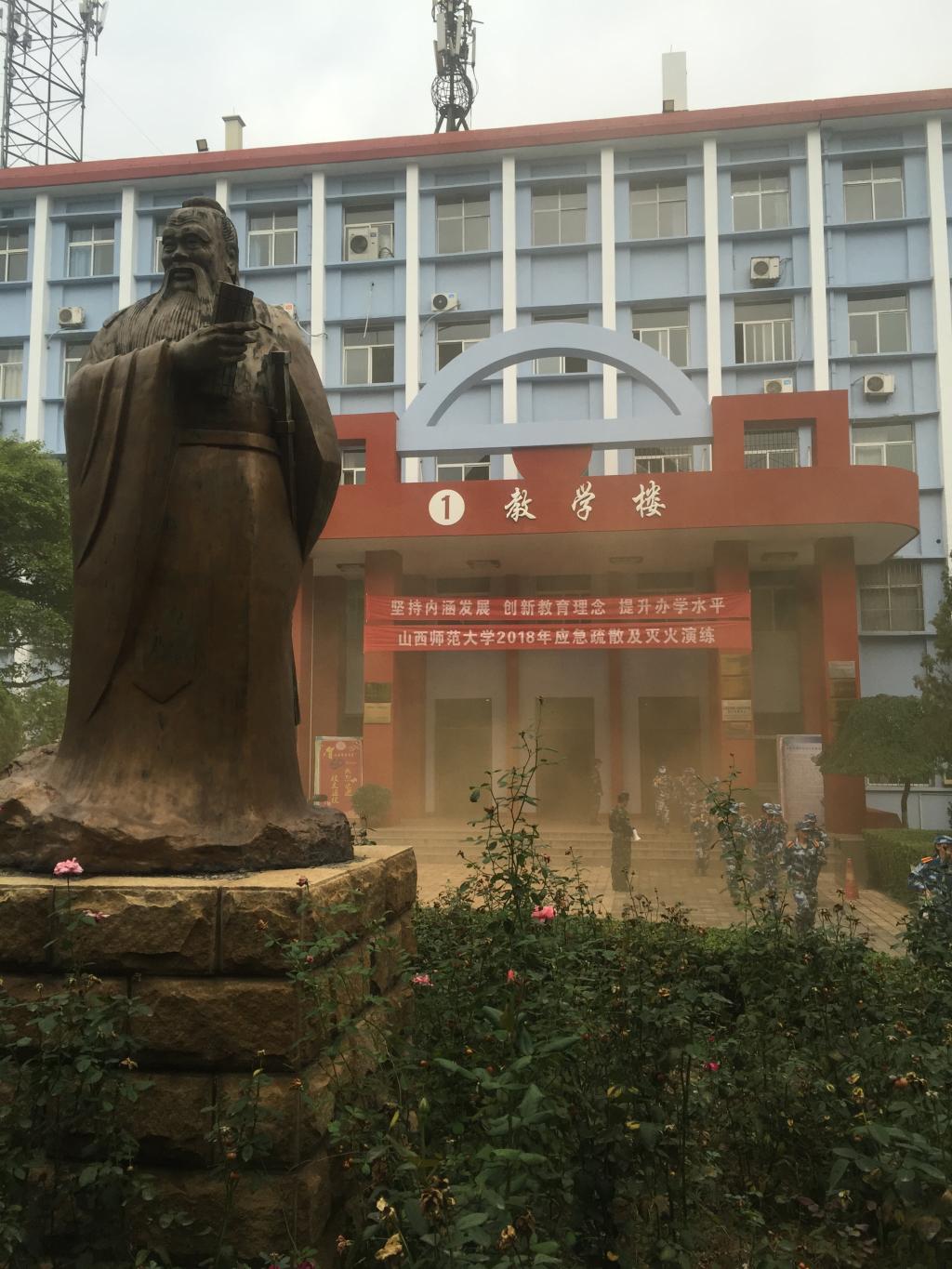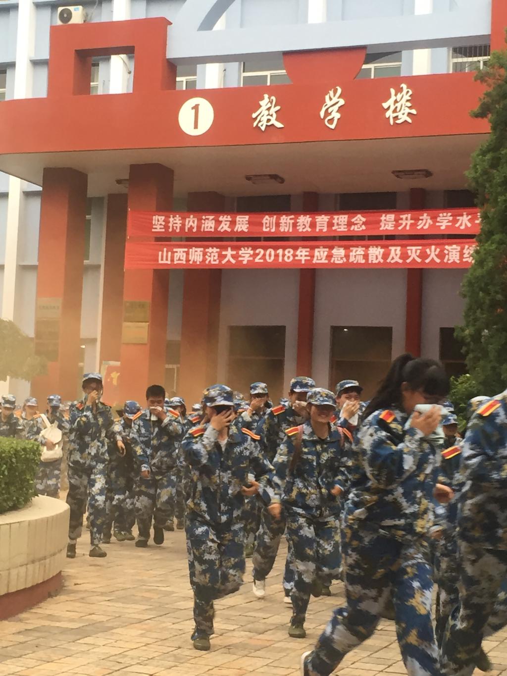 应急疏散演练开始的哨音发出后,在武警支队教官的指挥下,同学们用毛巾捂住口鼻,低头含胸快速有序的从教学楼逃生到空旷安全地带。