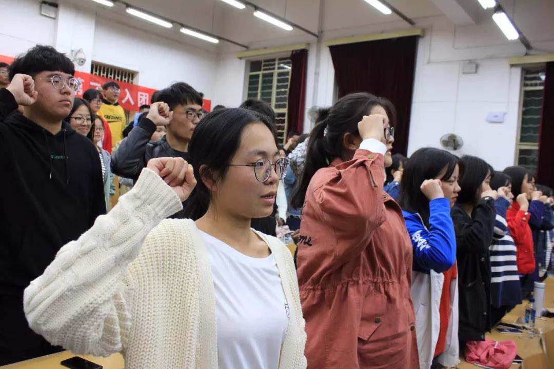 首先,新生们全体起立,奏国歌,现场气氛庄严肃穆。接着播放了由院团委技术组出品的迎新视频,视频帮助新生回忆了报道时的情景,展现了父母与子女之间的温馨场景,使在场的新生们深受感动。随后,阎老师号召大家坚定理想信念,坚持终身学习的理念,简单介绍了共青团史并带领大家详细学习了“三会两制一课”和共青团改革方案的相关知识,同时还寄语18级新生,表达了自己对新生们的殷切期望和要求。随着“我们是五月的花海”的歌声,全体新生起立,迎团旗,并齐唱团歌,重温入团誓词。嘹亮的歌声与誓词是他们蓬勃朝气的体现。优秀员工代表16级国家奖学金获得者李语和春秋读书会负责人周光全就入学以来的工作感想以及自己对团员的精神的理解进行了发言。