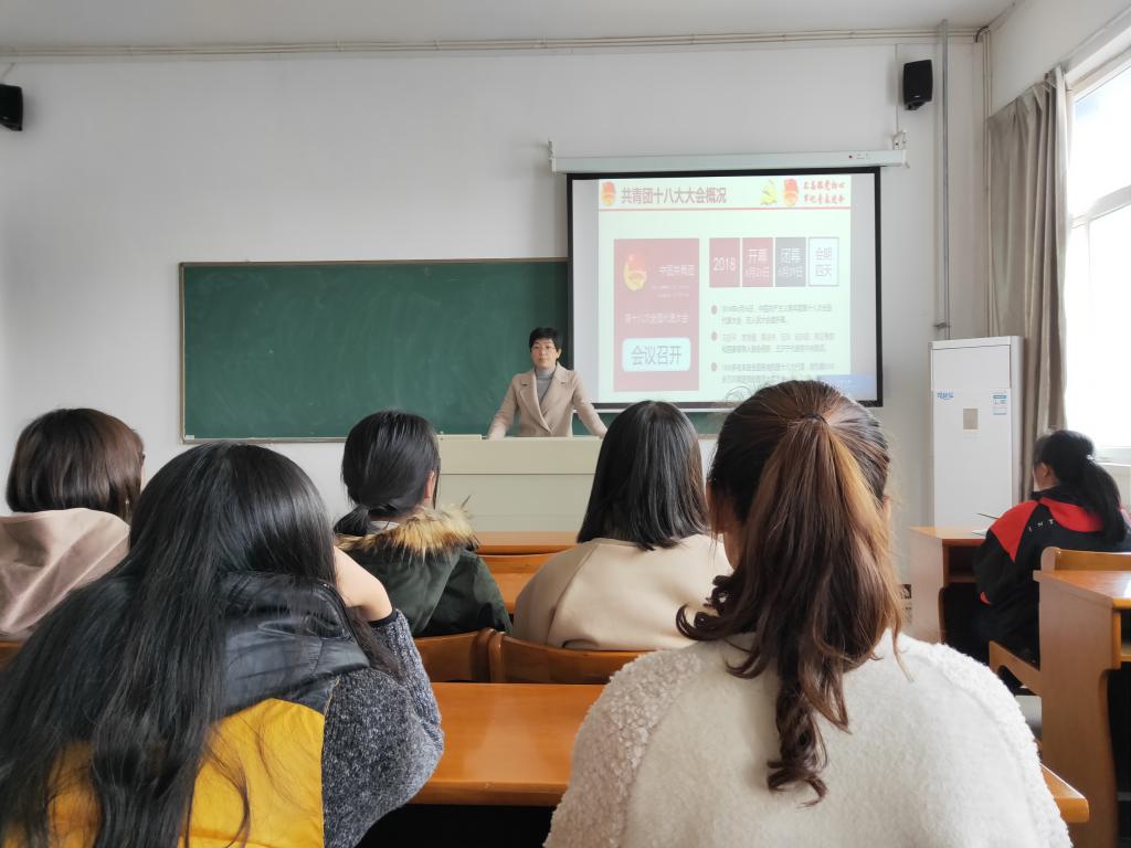 会上,院团委阎海燕老师以ppt课件的形式详细介绍了共青团十八大会议概况、共青团十八大中央领导致辞,共青团十八大报告的具体内容。她指出,“我们要牢记习近平总书记的谆谆教诲,始终坚定理想信念,着力锤炼高尚品格,不断增长能力才干,永远保持奋斗精神,勇于投身创新创造,勇当实现中华民族伟大复兴的生力军,奏响新时代的青春之歌。”随后,阎老师对公司11月基础团务工作进行了安排与部署,对低年级的团支部书记予以工作指导,要求一二年级各团支部召开学习传达共青团十八大精神的主题团日活动,切实做到联系青年,服务大局,当好桥梁,从严治团。最后,阎老师强调,员工干部要摆正位置,要勤于学习,敢于当担,勇做员工楷模。