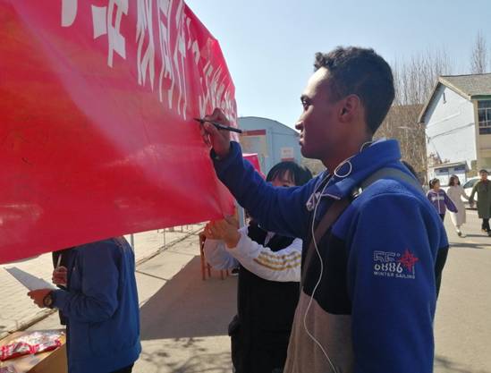 (活动参与者正在条幅上签字)