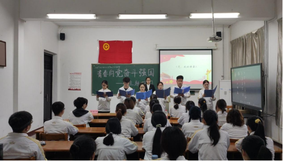 活动伊始,团支部书记介绍了开展本次主题团日的必要性,随后由《建党一百周年》短视频引入本次的主题“四史”知识竞答。知识竞答分为必答题和抢答题,题目形式多样,包括图片题、视频题、音频题、单选题和多选题五类题型。在活动过程中,同学们热情高涨,充分展示给我们属于这个时代的青年朝气。之后,一首改编版《少年》,一首诗歌朗诵《党,我的母亲》,把同学们的热情推向了高潮。活动最后,由团支部书记带领全体团员重温入团誓词,本次活动圆满结束。
