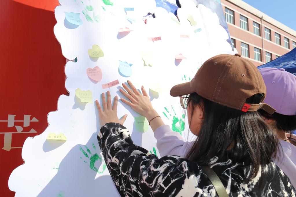 活动现场,同学们在印有树枝树干的纸板上使用颜料为空白的树枝树干增添了各具特色、别致多样的“树叶”;还有同学在便利贴上写下励志的话语贴在纸板上,鼓励正逢考试的学子,字里行间充满了对同学们的关怀与祝福;同学们还认真挑选制作精美的卡片挂在树上做装饰并合影纪念。活动现场气氛热烈且充满暖意,大家看着那一片自己亲手种下的“树叶”在微风中摇曳,露出了幸福的笑容,在潜移默化中将保护生态的观念厚植于心,校园中生出了春日的第一抹生机。