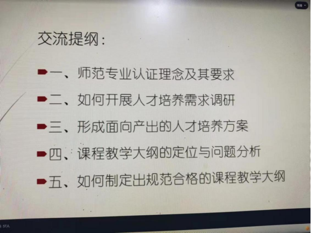 两位进校专家在线做了《基于专业认证的人才培养方案及课程教学大纲的制(修)订》(内容包括:师范专业认证理念及其要求;如何开展人才培养需求调研;形成面向产出的人才培养方案;课程教学大纲的定位与问题分析;如何制定出规范合格的课程教学大纲)和《师范类专业认证佐证材料调研及汇总》(内容包括:如何对标开展认证支撑材料整理工作;如何依据专家审核意见修改自评报告及完善相关支撑材料;认证材料准备的常见问题;认证材料准备的任务分解;阶段性任务的部署安排;重点任务的分工安排)的报告。