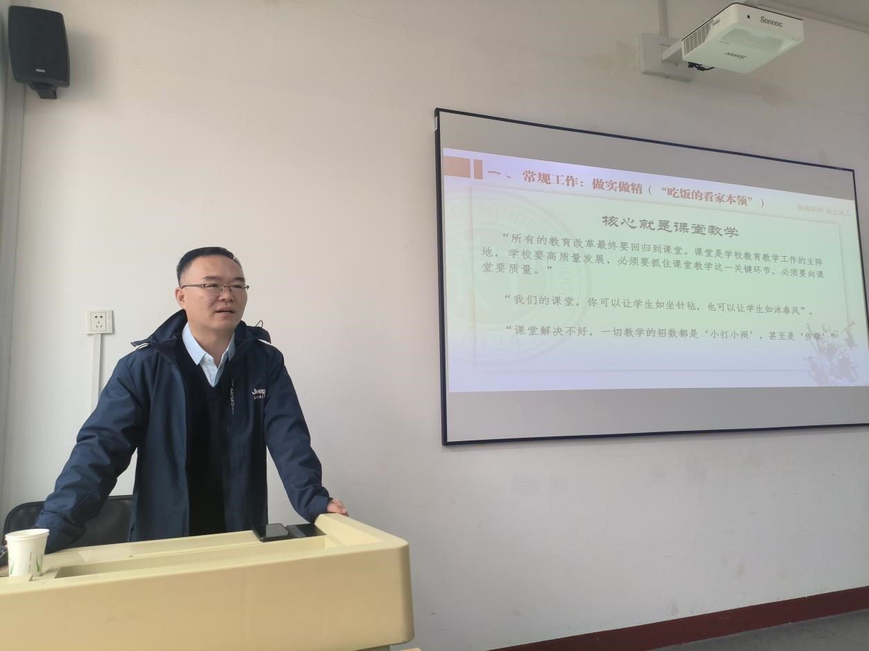 讲座中,靳老师以太原地区为例,结合具体数据分析了现阶段中学情况,他将中学历史教师的工作分为三大部分:以教学为主的常规工作、课题研究等延伸工作、以行政活动为主的辅助工作,并以自身多年从教经历着重讲解了教师的常规工作。他把教学归纳为备课、课堂教学、检测三大环节,并强调各个环节都要努力做实做精。在备课方面,靳老师结合太原市成成中公司“313课堂教学策略”从研究课标、研究教材、研究学情三个角度进行了阐释,结合具体教学内容进行了课例展示,具体形象地呈现了“主题教学”的操作方法。为充分展现“教-学-评”一体化,靳老师还从选题、改题、出题的经历讲述了命题在教师成长发展中的重要作用。在后面两个部分的讲述中,靳老师从自身参与梳理校史、课题研究、论文写作、构建课程体系与参与校园文化建设的经历分享了教师所需要参与的延伸性工作。针对教师的行政工作,他指出行政工作是教师“综合提升的一条路径”,但也要注意量力而行,教师始终应当做到以教学为主,练好“基本功”。